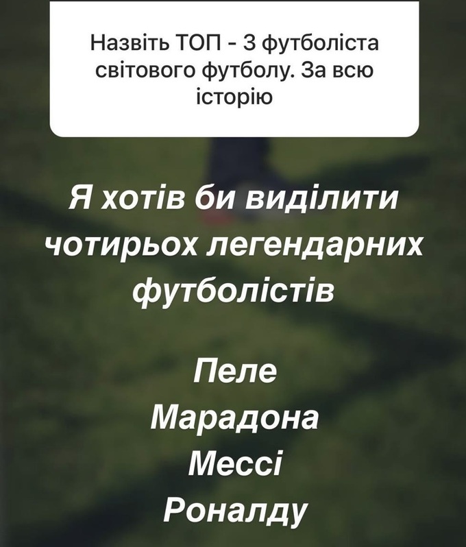 «Я хотел бы отметить четырех легендарных футболистов: Пеле, Диего Марадону, Лионеля Месси и португальца Криштиану Роналду», – ответил Шовковский в своем Instagram на вопрос подписчика о лучших футболистах в истории.