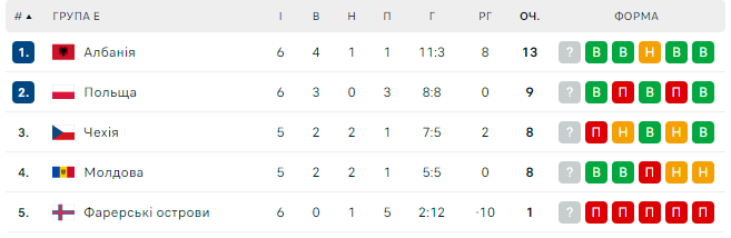 Турнирное положение: Албания (13), Польша (9), Чехия (8), Молдова (8), Фареры (1).
