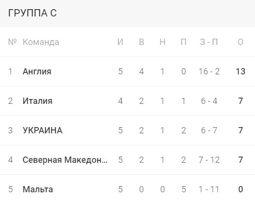 После 5 из 8 сыгранных матчей сборная Украины имеет 7 очков. Столько же у Италии и Северной Македонии. Но итальянцы сыграли на один матч меньше, хотя впереди у них еще игра в Англии. У нас после игры с македонцами встреча с Мальтой и очное противостояние со Скуадрой 20 ноября в номинально домашнем Леверкузене.