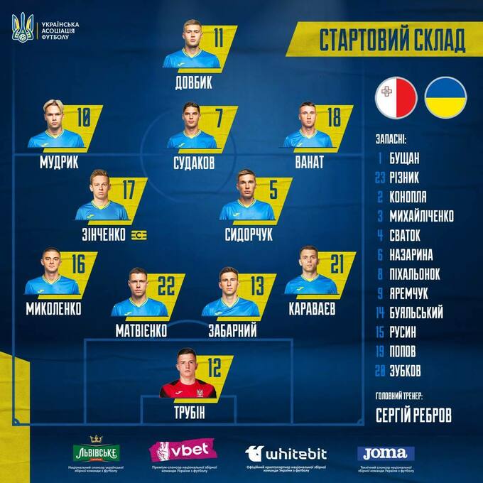 Украина: Трубин, Миколенко, Матвиенко, Забарный, Караваев, Сидорчук, Зинченко, Судаков, Мудрик, Ванат, Довбик