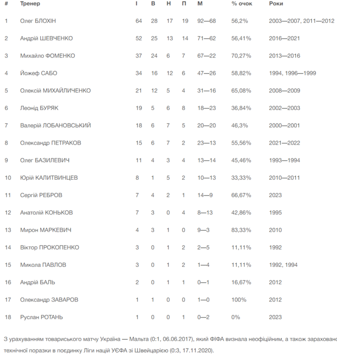 После октябрьских матчей национальной сборной Украины против Северной Македонии (2:0) и Мальты (3:1) в отборочном турнире Евро-2024 произошло изменение в исторической таблице тренеров сине-желтых.