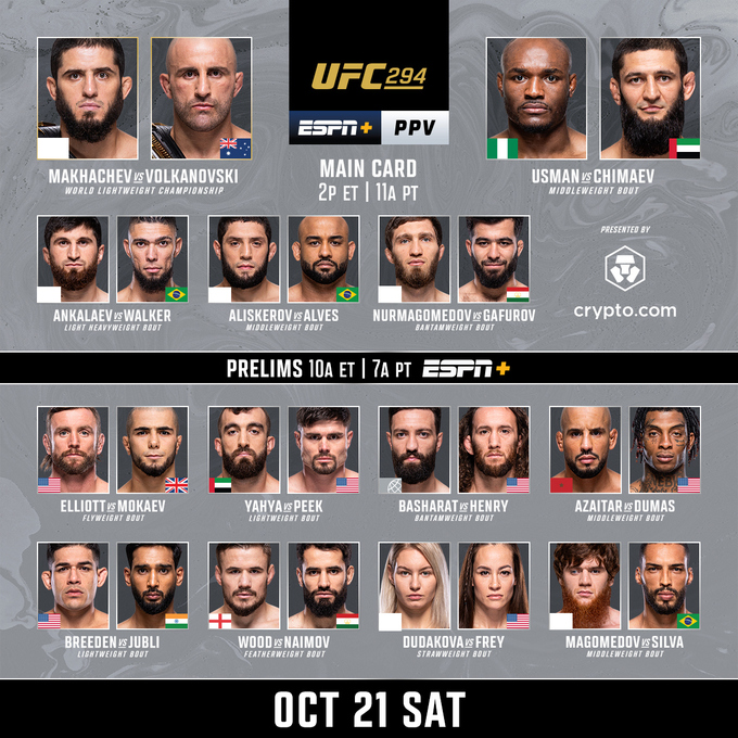 21 октября в Абу-Даби (ОАЭ) запланирован турнир по смешанным единоборствам UFC 294.
