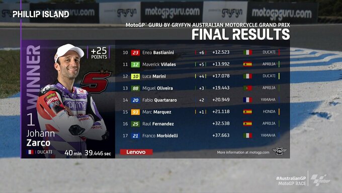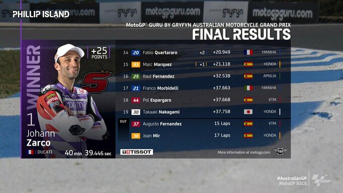 Весь этап доминировал партнер Зарко по команде Хорхе Мартин, который был близок к своей очередной победе. Испанец выиграл квалификацию, установив новый рекорд круга, а в гонке лидировал со старта до последнего круга. Но ошибка Мартина на последнем круге отбросила его на итоговое пятое место.