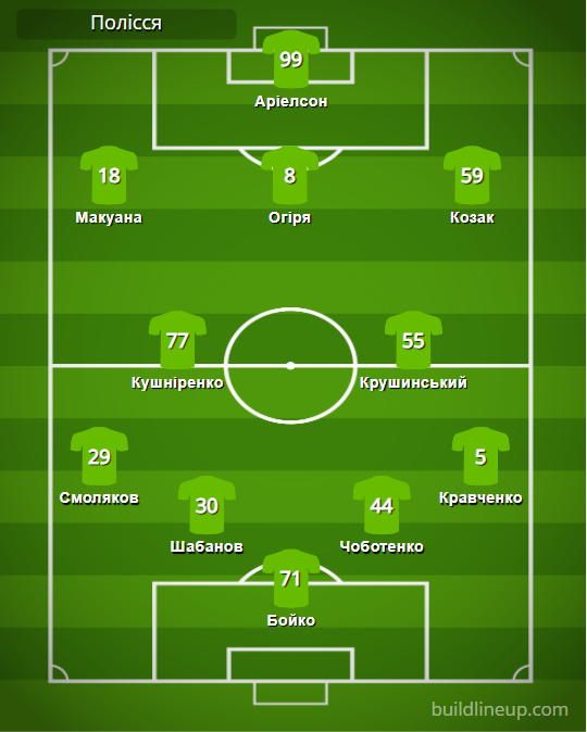«Полесье»: Бойко – Смоляков, Шабанов, Чоботенко, Кравченко – Кушниренко, Крушинский (Грицук, 46) – Макуана (Тейлор, 73), Огиря, Козак – Ариелсон (Шастал, 66).