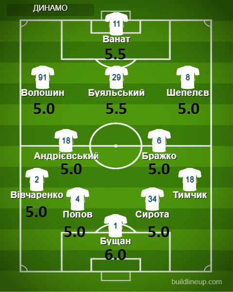 Замены Динамо: Дубинчак - 5,5, Шапаренко - 5,5, Бенито - 5,0, Кабаев - 5,0, Царенко - б/о