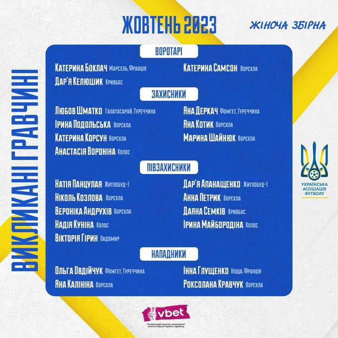 Вратари: Екатерина Самсон («Ворскла» Полтава), Дарья Келюшик («Кривбасс» Кривой Рог), Екатерина Боклач («Марсель», Франция).