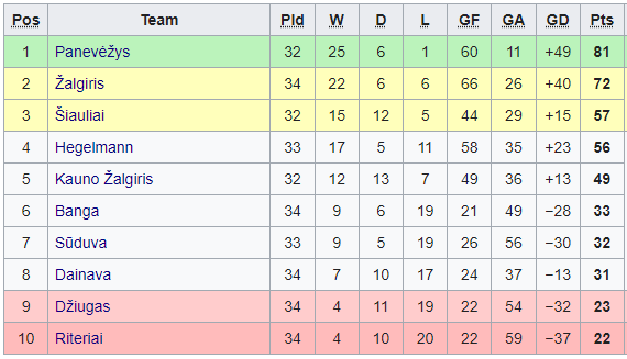 В 34-м туре команда, которую тренирует Джино Леттьери, сыграла вничью 0:0 с футболистами клуба «Хегельманн». Разница составляет 9 очков, а у «Жальгириса» осталось только два матча впереди. Паневежису» осталось сыграть 4 поединка до конца сезона.