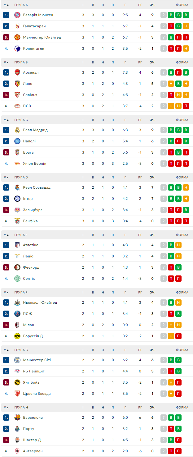 Испанский «Реал» и немецкая «Бавария» лидируют в своих группах, не потеряв ни очка (9 баллов из 9).