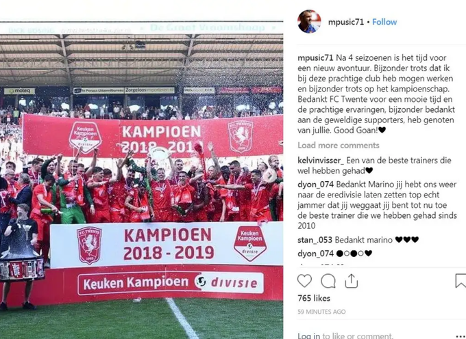 Но сезон-2018/19 действительно стал для Пушича прорывом. Команда из Энсхеде под руководством боснийца уверенно заняла первое место, набрав в 38 турах 80 очков и опередив ближайшего преследователя – «Спарту» из Роттердама – на 11 пунктов. Но не все оказалось так гладко, и после завершения сезона Марино уволили, даже несмотря на то, что он был признан лучшим тренером Первого дивизиона по итогам сезона.