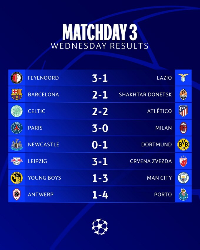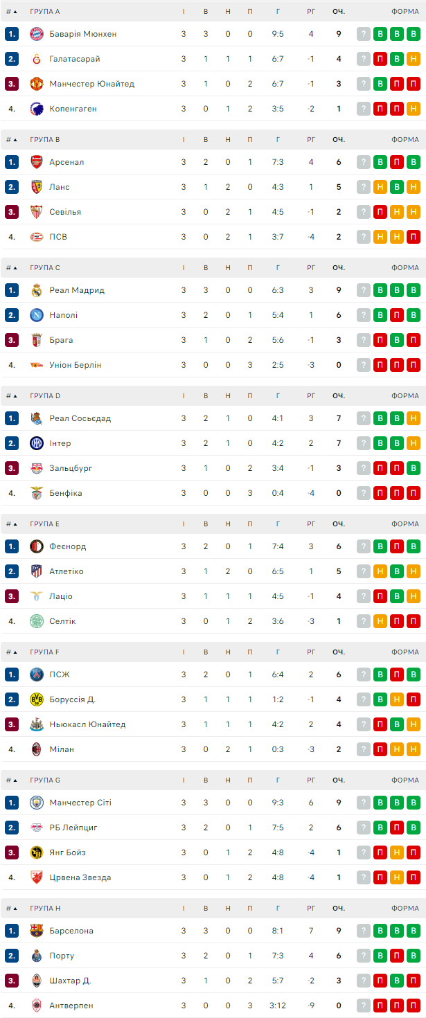 Лидирует Барселона (9 очков), далее идет Порту (6 баллов). Португальская команда разгромила бельгийский Антверпен (4:1), который пока что идет без набранных очков.