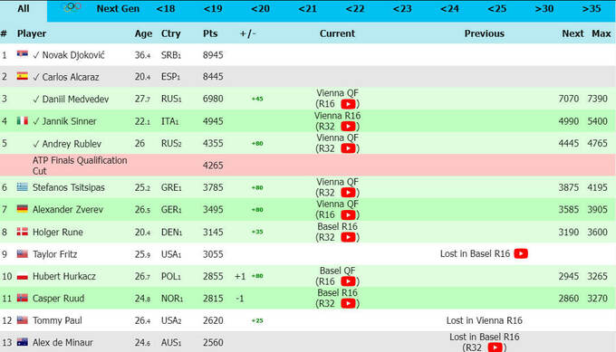 С Чарли и Ноле. Определены 5 из 8 участников Итогового турнира АТР 2023