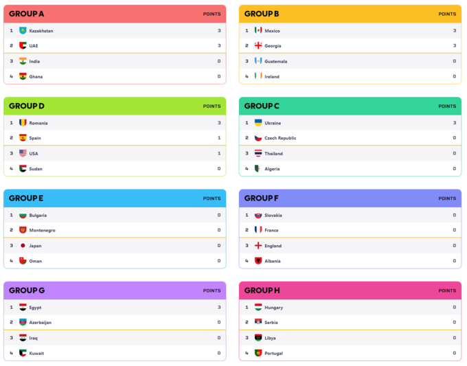 Далее в группе C Украина сыграет против Таиланда (28 октября) и Чехии (30 октября). В 1/8 финала выйдут по две лучшие сборные из каждой из 8 групп.