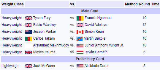 - Тайсон Фьюри (33–0–1, 24 KO) – Франсис Нганну (дебют)