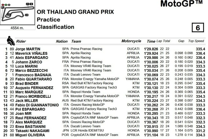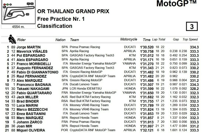 В обеих сессиях лучшим стал лидер Pramac Хорхе Мартин, а вторым — Маверик Виньялес из Априлии. В первой практике испанских райдеров разделили 0.238 секунды, а во второй – 0.098.