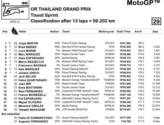 Лидер команды Pramac Хорхе Мартин без проблем выиграл спринт на Гран-при Таиланда, который проходит на трассе «Чанг» в Бурираме. Испанец стартовал с поула, лидировал со старта до финиша, установил лучший круг и на финише опередил Брэда Биндера из КТМ, который стал вторым, почти на секунду. Третьим финишировал Лука Марини из VR46, который стартовал со второго места, но в середине дистанции пропустил Биндера.