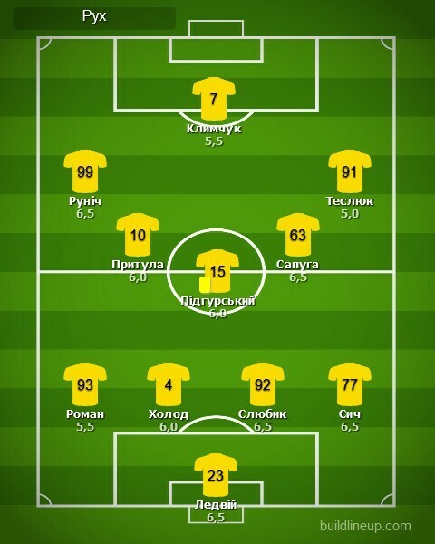 «Рух»: Ледвий, Сыч, Слюбик, Холод, Роман, Пидгурский (Плюман, 73), Сапуга, Притула (Пастух, 55), Теслюк (Квасница, 55), Рунич (Соломон, 73), Климчук