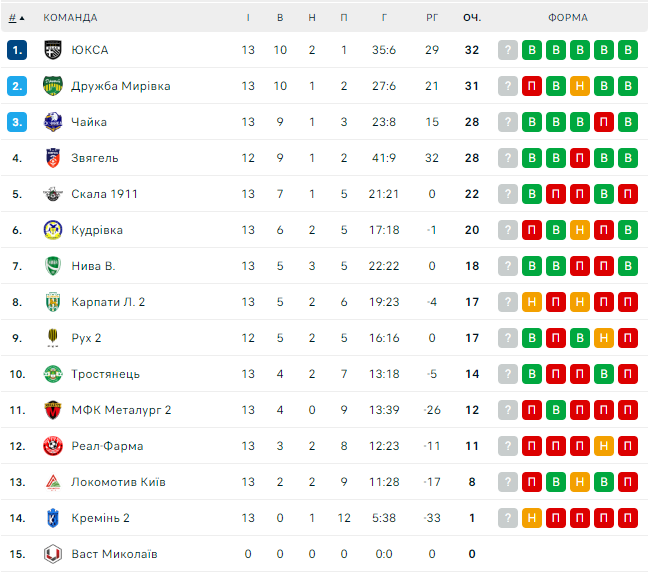 Лидеры Второй лиги: ЮКСА (32), Дружба (31), Чайка, Звягель (по 28).