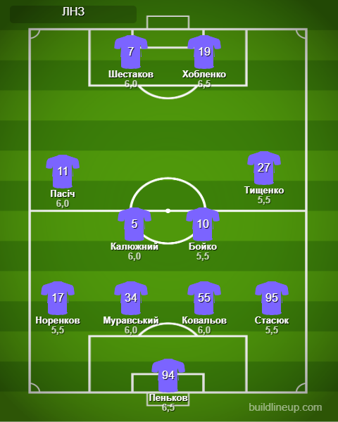 ЛНЗ: Пеньков - Стасюк, Муравский, Ковалев, Норенков - Тищенко (Олейник, 63), Бойко, Калюжный, Пасич (Савин, 82) - Хобленко, Шестаков (Наумец, 83).