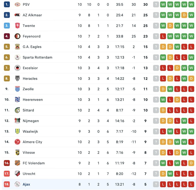 После этого поражения недавний полуфиналист ЛЧ и самый титулованный клуб Нидерландов опустился на последнюю строчку чемпионата с 5 очками в активе.
