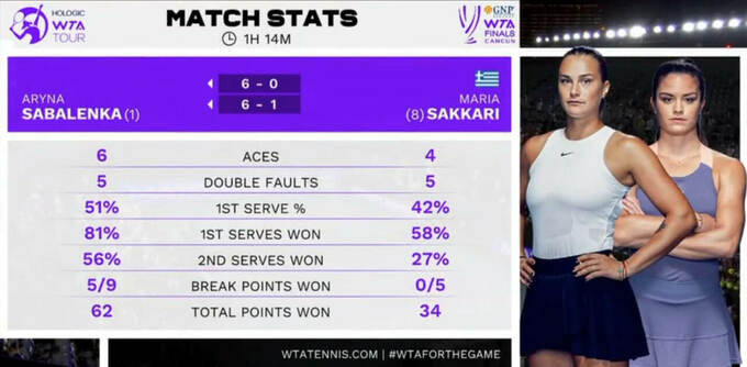Игра завершилась в двух сетах за 1 час и 15 минут. Саккари сумела взять всего 1 гейм у Соболенко.