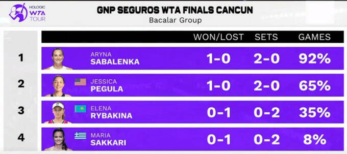 The World No. 1 has come to play 🎾@SabalenkaA defeats Sakkari to secure her opening match in the Bacalar Group.#WTAFinals pic.twitter.com/Mspvh9mbdq