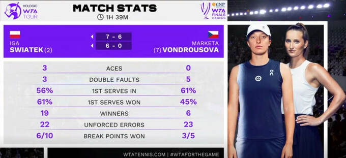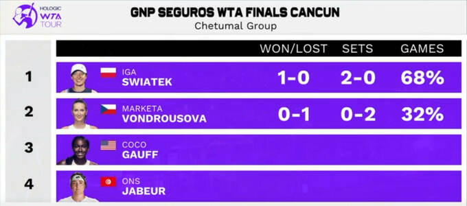 Finishing strong 💪@iga_swiatek moves past Vondrousova and through her first match in the Chetumal Group!#WTAFinals pic.twitter.com/BFdJFfdd2R
