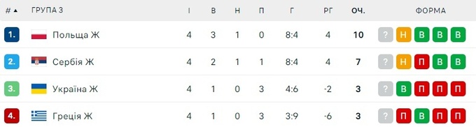 Таким образом, украинская команда в таблице группы занимает 3-е место, имея 3 очка, но лучшие дополнительные показатели, чем у команды Греции. Лидирует Польша (10 очков), вторая позиция у Сербии (7 пунктов). Напомним, обладатель первого места поднимется в дивизион А, а обладатель второй позиции примет участие в стыковых матчах.