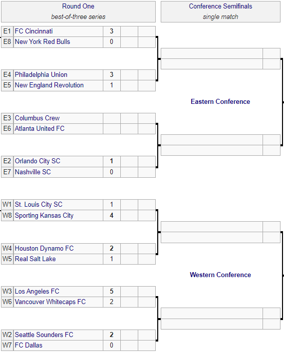 В первых матчах серий победили команды Цинцинатти, Филадельфия Юнион, Орландо Сити (восточная конференция), Спортинг Канзас-Сити, Хьюстон Динамо, Лос-Анджелес, Сиэттл Саундерс (западная конференция).