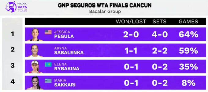 Джессика и Соболенко играют в одной группе с Марией Саккари и Рыбакиной. В последнем туре Пегула встретится с Саккари, а Арина сыграет против Рыбакиной.