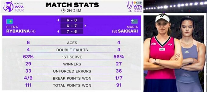 Елена Рыбакина (Казахстан) – Мария Саккари (Греция) – 6:0, 6:7 (4:7), 7:6 (7:2)