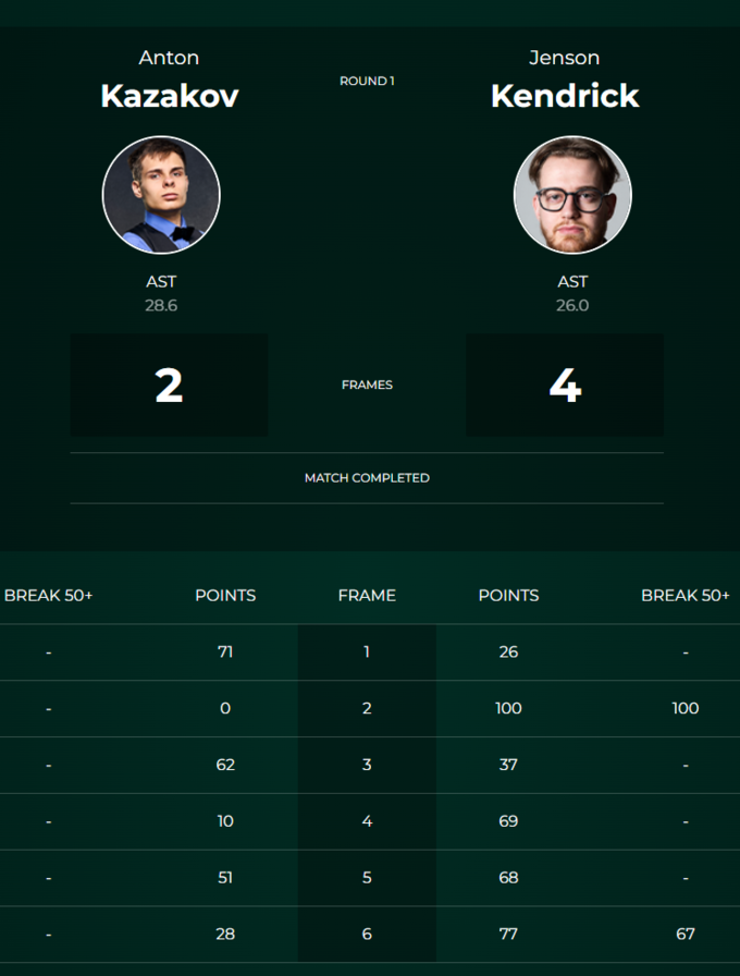 Антон Казаков (Украина) – Дженсон Кендрик (Англия) – 2:4