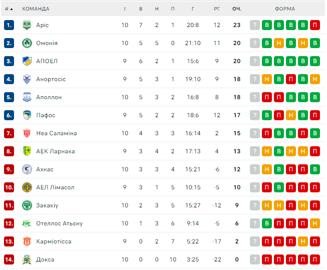 Омония идет на 2-месте, набрав с клубом АПОЭЛ по 20 очков. Лидирует Арис Лимасол (23 балла).