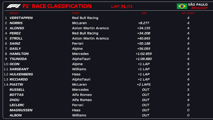 Отметим неудачный результат Мерседеса. Джордж Расселл и Льюис Хэмилтон, которые год назад в Бразилии оформили победный дубль, своих фанов не порадовали: Хэмилтон финишировал 8-м, а Расселл сошел.