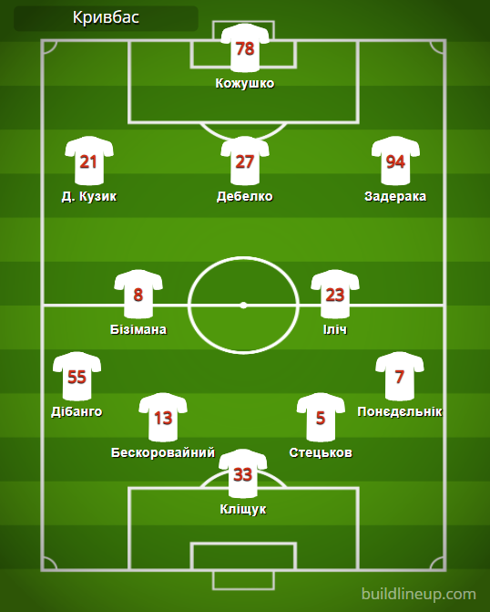 «Кривбасс»: Клищук – Дибанго, Стецков, Бескоровайный, Понедельник – Илич (Татарков, 62, 82), Бизимана – Д. Кузык (Близниченко, 81), Дебелко (Приходько, 61), Задерака – Кожушко (Устименко, 90+1).
