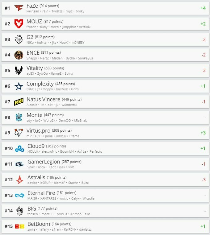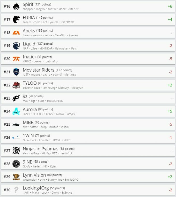 Антигероем сегодняшнего рейтинга, кроме Fnatic стал MIBR, который опустился с 20 на 25 место.