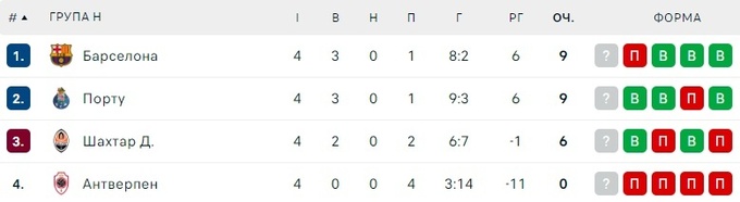 Донецкий «Шахтер», как известно, в Гамбурге со счетом 1:0 переиграл «Барселону». В другом поединке группы Н «Порту» дома добился победы 2:0 над «Антверпеном».
