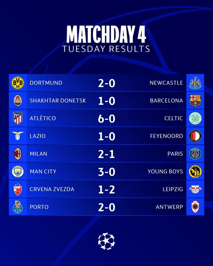 7 ноября состоялись поединки 4-го тура Лиги чемпионов 2023/24.