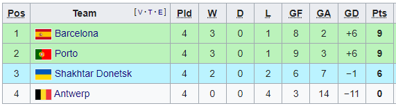 Турнирное положение после 4-го тура: Барселона (9 очков), Порту (9), Шахтер (6), Антверпен (0).
