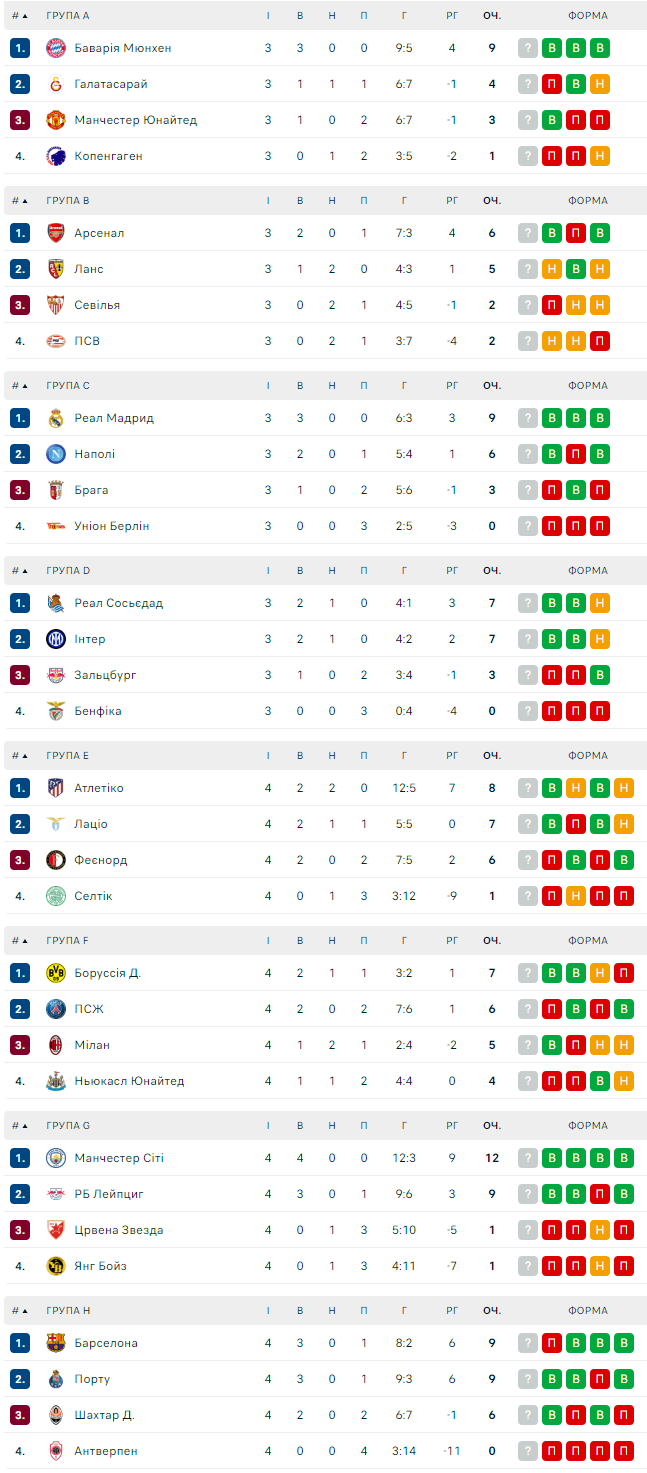 Турнирные таблицы Лиги чемпионов. Шахтер остается на третьем месте в группе