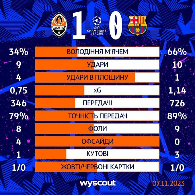 У «Барселоны» больше ударов всего, однако у «Шахтера» четыре удара в створ ворот, тогда как у соперника лишь 1 такой удар. По xG (ожидаемые голы) гости были чуть лучше – 1,14 против 0,75.