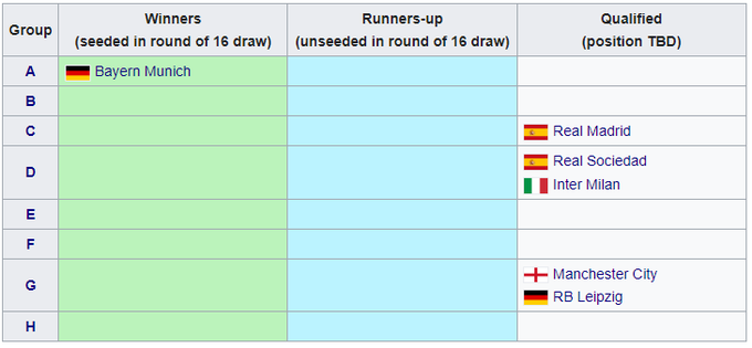 Две лучшие команды каждой группы выйдут в 1/8 финала. Команды, занявшие третьи места, будут переведены в плей-оф раунда Лиги Европы, а команды, занявшие четвертые места, выбывают из европейских соревнований в этом сезоне.