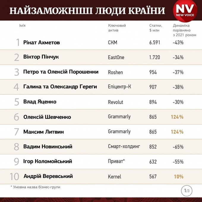 В ежегодном рейтинге, который каждую осень формирует издание, начиная с 2006 года, Ахметов удерживает первенство с состоянием в 6,591 миллиардов долларов. По сравнению с прежней версией рейтинга, которая выходила в свет еще до войны, осенью 2021 года, бизнесмен потерял 43% активов.