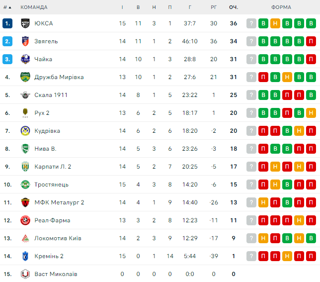 Лидеры Второй лиги: ЮКСА (36), Звягель (34), Чайка, Дружба (по 31).