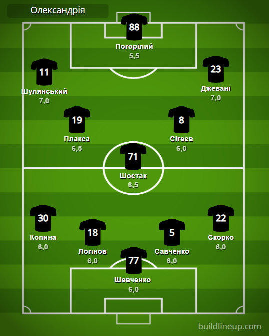 «Александрия»: Шевченко – Копина, Логинов, Савченко, Скорко – Плакса (Кравченко, 87), Шостак, Сигеев (Кулаковский, 69) – Шулянский (Базаев, 90+2), Погорелый (Кулаков, 69), Джевани (Безерра, 69).