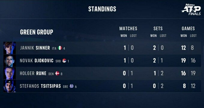 В Зеленой группе Новак и Хольгер играют вместе с Янником Синнером и Стефаносом Циципасом. Ранее итальянец выиграл у грека в двух партиях.