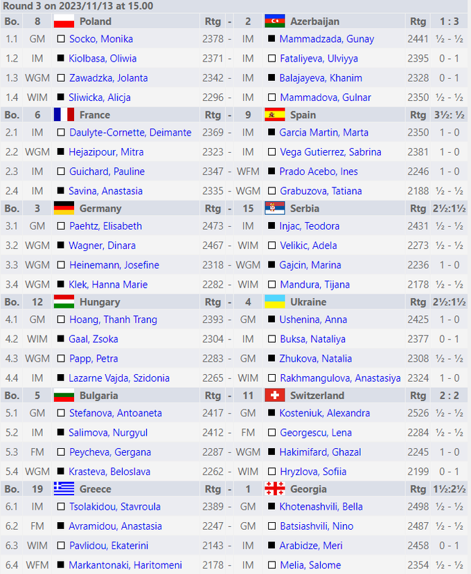 В 3-м туре украинки проиграли команде Венгрии (1.5:2.5). Хотя Букса выиграла на 2-й доске, однако проиграли Ушенина (на 1-й) и Рахмангулова (на 4-й). Вничью свою партию сыграла Жукова на 3-й доске.