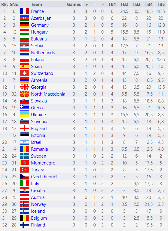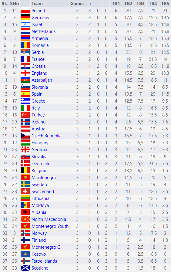 Лидерами являются команды Польши и Германии (у мужчин), Франции и Азербайджана (у женщин), не потерявшие очков (6 из 6).