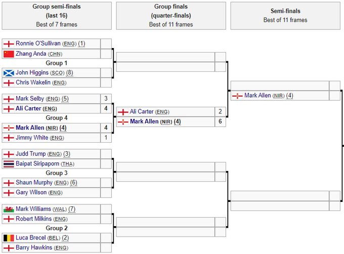 Марк Аллен сначала одержал победу над Джимми Уайтом со счетом 4:1, а во второй половине дня победил Али Картера со счетом 6:2 и вышел из группы четырех в полуфинал.
