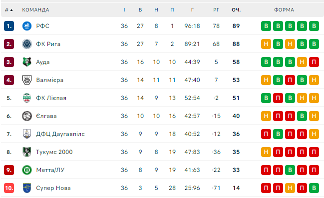 А вот Рига, лидировавшая перед последним туром, не сумела обыграть команду Валмиера (1:1). Пропустив первой от Алиуна Ндойе на 61-й минуте, Рига сумела только сравнять счет на 90-й минуте усилиями костариканца Энтони Контрераса.