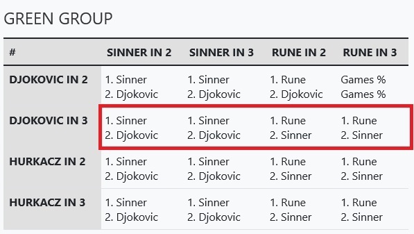 Невыигрыш у Хуркача в двух сетах означает, что Джоковичу во втором матче сегодняшнего игрового дня нужна любая победа Янника Синнера над Хольгером Руне. В таком случае Новак займет второе место в квартете и выйдет в полуфинал на победителя Красной группы.